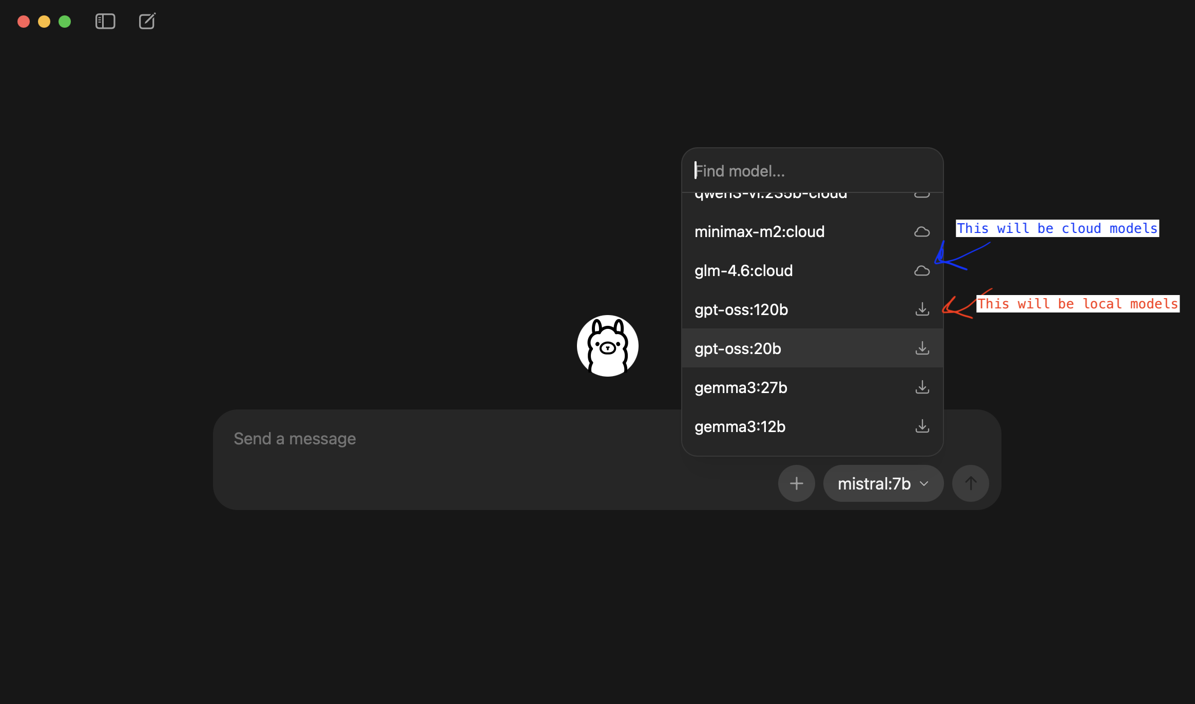 As explained above, only recently OllAMA released a chat UI to make it easier to interact with the LLMs. You can already try it if you want with the steps below. However, this chat UI is not our focus here because we want to tailor apps for our use cases. Nonetheless, you can already start playing with local or cloud LLMs!