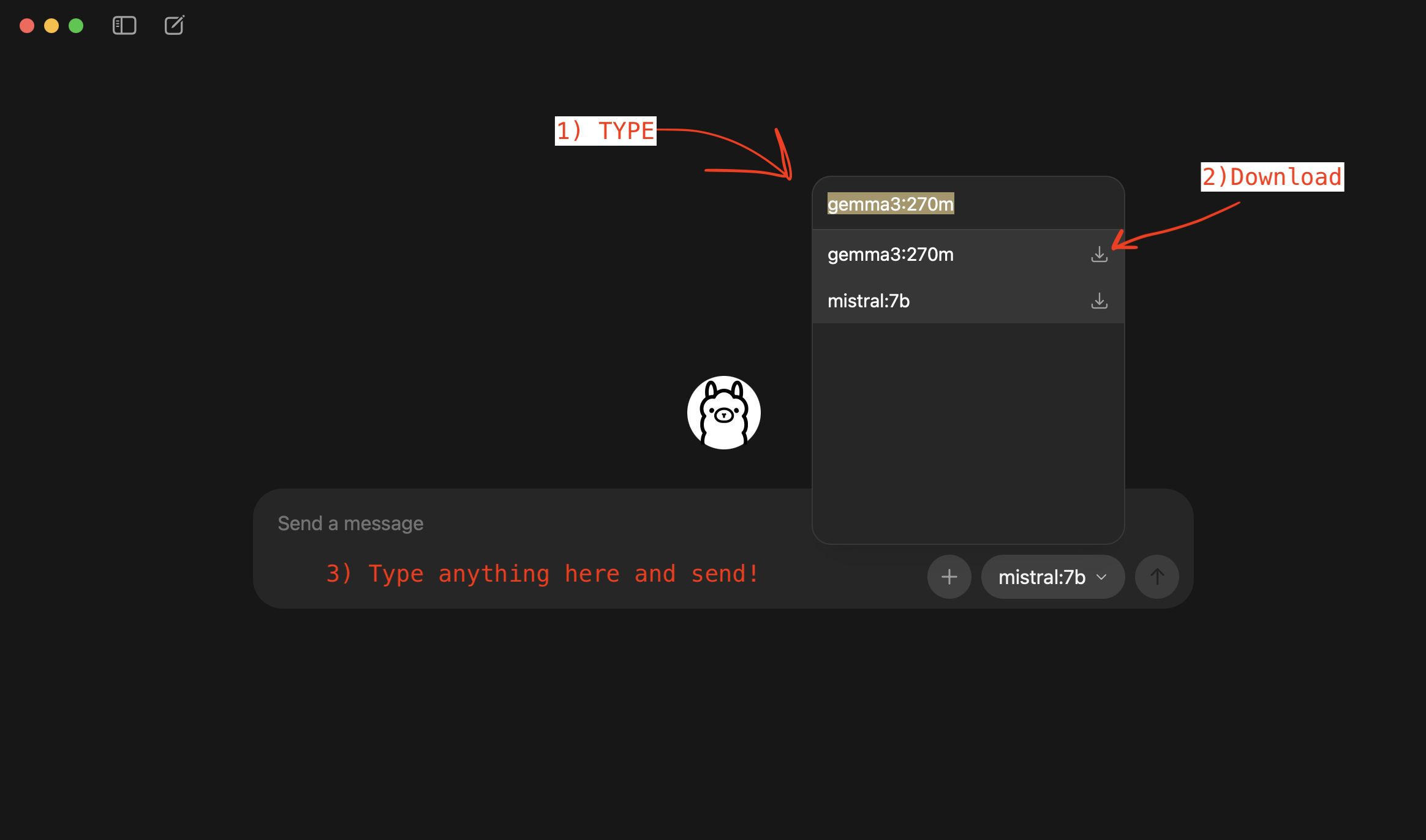 - Download Ollama (50MB) at https://ollama.com/ (takes up about 125MB for Mac in harddrive storage)